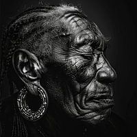 Dit opvallende portret legt de diepe rimpels en wijze blik vast van een oudere persoon wiens gezicht een verhaal van levenservaringen vertelt. De details van de huidtextuur en de traditionele oorsieraden benadrukken de culturele diepgang en het erfgoed. Perfect voor verzamelaars van zwart-wit fotografie en liefhebbers van etnische…