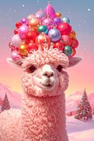 Een roze alpaca, met een berg met kerstballen op zijn hoofd, staat in een besneeuwd landschap met versierde kerstbomen. De kerstballen hebben mooie felle kleuren en pastelkleuren. De alpaca heeft een lief snuitje, schattig en zacht. Het beeld is met behulp van ai gegenereerd.