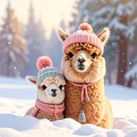 Mama alpaca ligt met haar jonge veulen in de sneeuw terwijl de sneeuwvlokken naar beneden dwarrelen. Ze hebben mutsen op en sjaals om wat eigenlijk niet nodig is want ze hebben geen last van de kou door hun dikke vacht. Ze hebben lieve schattige snuitjes, klaar om mee te knuffelen. Het beeld is met behulp van ai gegenereerd.
