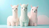 Drie schattige alpaca's, in licht roze en licht blauw, staan naast elkaar voor een pastelkleurige achtergrond. Ze zijn langharig en kortharig, ze hebben schattige snuitjes. Het beeld is met behulp van ai gegenereerd.