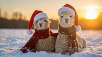 Twee schattige alpaca's, met kerstmutsen op en een sjaal om, liggen in een besneeuwd landschap tijdens zonsondergang. Ze hebben geen last van de kou, dit komt door hun dikke wollige vacht en hun muts en sjaal. Ze genieten van het zonnige koude weer. Het beeld is met behulp van ai gegenereerd.
