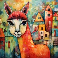 Illustratief motief van een alpaca. De afbeelding ziet eruit als een handgeschilderd schilderij en doet denken aan de stijl van Marc Chagall.