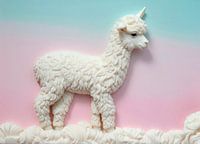 Een jonge Alpaca, zacht en schattig, gemaakt van zeep. Hij heeft een lief schattig snuitje en loopt op wolken, ook van zeep gemaakt. De achtergrond is van zachte pasteltinten gemaakt. Het beeld is met behulp van ai gegenereerd.