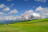 Seiser Alm of Alpe di Siusi - met op de achtergrond de berggroep Sassolungo - Langkofel tijdens de lente in de Dolomieten. Gele voorjaarsbloemen in de weiden en enkele houten chalets op de hoogvlakte in de Alpen, Trentino Alto Adige, Zuid-Tirol, Italië.