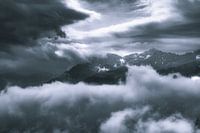 De Alpen gehuld in wolken, vastgelegd in zwart-wit, stralen een tijdloze en mystieke schoonheid uit. De ruige bergpieken steken scherp af tegen de grijze sluiers van mist en wolken, terwijl het licht subtiel speelt met schaduwen op de rotswanden en sneeuwvelden. Zonder kleur wordt de focus gelegd op textuur en contrast: het diepe zwart…