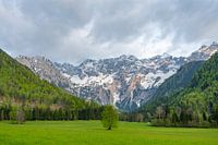 Zgornje Jezersko vallei in Slovenië tijdens een mooie lentedag met de bergketen rond de Grintovec bergtop in de Kamnik-Savinja Alpen.