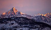 De opgaande zon zet de Bietschhorn in een prachtig licht, ook wel Alpenglow genoemd. Gezien vanaf Grächen, Wallis, Zwitserland.