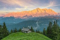 Uitzicht op het Wettersteingebergte bij de Schellalm in Beieren op een zomeravond.