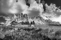 De foto toont de Geislerhütte met de brede Geisleralm ervoor en de bergketen erachter, de Geislergruppe.