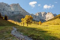 Mooi is het in het Engtal aan de Großen Ahornboden in de Karwendel kort na Hinterriß in Oostenrijk. In de herfst duurt het lang voordat de zon zich een weg baant over de berg, de schaduwen kunnen mooi in beeld worden gebracht.