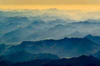 De nevel in de dalen van de Alpen geeft het loopschot ruimtelijke diepte. Zonsondergang boven het Salzburger Land, Oostenrijk