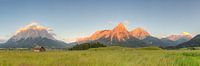 Alpenpanorama gezien vanaf het Ehrwaldbekken bij Lermoos, met de Zugspitze aan de linkerkant van de foto achter de wolken en de dominante zonnetop, die door de laatste zonnestralen van de dag in een warm licht baadt.