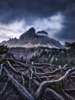 Berglandschap in de Dolomieten in Italië / Zuid-Tirol. Bergpanorama vanaf de Pleitlerkofel op de Würzjoch in het mystieke avondlicht. Een ongerepte en ongerepte natuur en landschap in de Alpen met machtige boomwortels, die zich daar door de harde ondergrond vaak bovengronds verspreiden. Spannende en laaghangende wolken en een naderende…