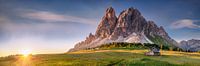 Berglandschap als panorama met een kleine alpenhut op de alpenweide bij de Würzhoch in Zuid-Tirol in Italië. Zie de Dolomieten in Italië met de machtige berg Peitlerkofel als een prachtig bergpanorama in het prachtige ochtendlicht. Op meer dan 2000m hoogte is deze droomachtige Alm in dern mountains / alpen. In de ochtend bij zonsopgang…