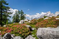 Tussen de rotsen bloeien talloze alpenroosjes die het berglandschap aan de voet van de Dachstein en Bischofsmütze een roze teint meegeven.