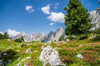 Tussen de rotsen bloeien talloze alpenroosjes die het berglandschap aan de voet van de Dachstein en Bischofsmütze een roze teint meegeven.