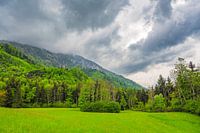 Alpenuitzicht in de lente in de oostelijke Alpen in Karinthië met een dramatische lucht op de achtergrond met frisgroene bomen op de voorgrond.