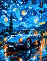 De Alpine A110, een meesterwerk van autotechniek, is opnieuw vormgegeven met conceptkunst van de Sterrennacht. Zijn strakke lijnen en agressieve houding zijn versierd met wervelende blauwe, gele en witte tinten die doen denken aan Van Gogh's iconische schilderij. Deze samensmelting van snelheid en kunstzinnigheid creëert een adembenemend visueel, dat zowel prestaties als creativiteit viert.