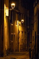 De avond is gevallen, de lantaarns zijn aan en verspreiden een zacht gelig licht in een verlaten straat van een Frans dorpje.
