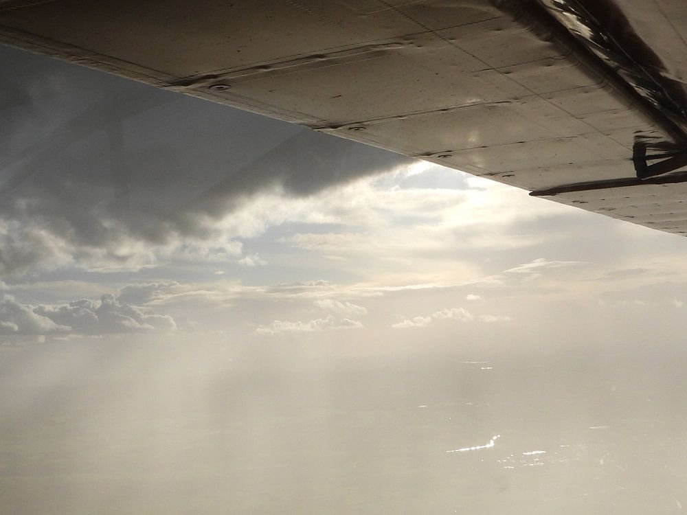 Het is een licht buitje maar de sfeer is betoverend zo onder de vleugel van de pipercub