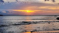 De afbeelding is een beschrijving van een schilderachtige zonsondergang boven de oceaan, waarbij de zon een warme, gouden en oranje gloed over de lucht en het water werpt. De scène toont een zand- of rotsstrand op de voorgrond, met zachte golven die breken op de kust, en verschillende kleine boten en verre landmassa's in silhouetten…