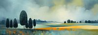 Een grillig landschap strekt zich uit over het frame, gekenmerkt door gestileerde bomen en glooiende heuvels onder een bewolkte hemel. De kleuren zijn gedempt met spatten van helderheid, waardoor het landschap een droomachtige kwaliteit krijgt.