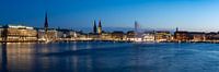 Hamburg laat zich van zijn mooiste kant zien: deze foto vangt het panorama van de Inner Alster tijdens het blauwe uur - het magische moment tussen dag en nacht wanneer de stadslichten ontwaken en de lucht oplicht in zachte tinten blauw en violet.