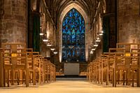 Het achterschip van een schitterende kerk met die nog dienst doet als kerk. Met op de voorgrond stoelen. De ramen zijn voorzien van glas in lood