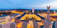 Uitzicht vanaf de Nikolaikirchekerk over de oude markt en het stadspaleis met 's avonds het Fortuna-portaal in Potsdam.