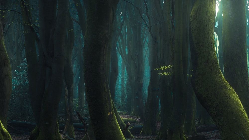 Donker bos met licht door de bomen. Prachtige bemoste beuken in het Speulderbos.
