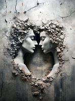 Portret van een man en een vrouw vereeuwigd in steen met als thema liefde en verbondenheid.