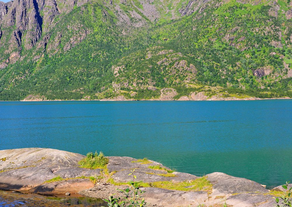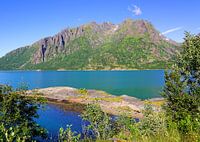 Fjord auf der Insel Austvågøya auf den Lofoten. Nordland, Norwegen. Sommer 2016 (Juli). (Austvagoya, Austvagöya, Sloverfjorden, Slöverfjord)
