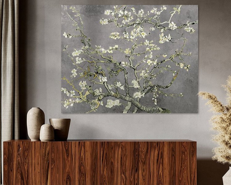 Koop dit schilderij Amandelbloesem van Vincent van Gogh (licht grijs) (gezien bij vtwonen) van Masters Revisited als reproductie op canvas, aluminium dibond, (ingelijste) fotoprint, behang en ArtFrame, op maat geprint in Fine-Art kwaliteit.