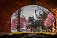 Lente op de Main in een metropool. Amandelbloesemboom op de Main, voor de skyline van Frankfurt