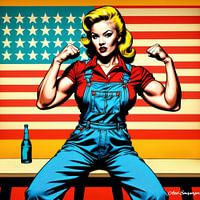 Amerikaanse powervrouw in tuinbroek op een bankje voor de Amerikaanse vlag en een fles bier, Iconic Women