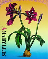 Een litho, ofwel steenafdruk van een amaryllis die uit de bloemenbol groeit. Een kleurrijk grafisch beeld.