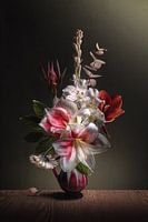 In dit kleurrijke bloemstuk komen de krachtige amaryllis, speelse alstroemeria en vrolijke gerbera samen in een harmonieus geheel. Tussen de bloemen bevinden zich twee kleine verrassingen: een lieveheersbeestje en een slak, subtiele details die dit werk een extra laag van verwondering geven.