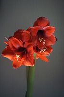 Schitterende rode amaryllissen die uit een bloembol groeide. De achtergrond is wit behang zodat de rode kleuren mooi tot zijn recht komt.