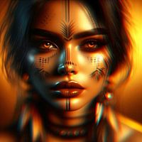 Dit opvallende digitale kunstwerk laat een schoonheid zien die is geïnspireerd op het Amazonegebied en baadt in warm oranje licht - een sfeer die doet denken aan vuur en zonsondergang. Haar lange, donkere haar omlijst een gezicht met tribal-geïnspireerde gezichtstatoeages die erfgoed, kracht en identiteit symboliseren. De sierlijke kralenketting met meerdere strengen en de oorbellen met veren versterken de culturele diepte en spirituele expressie van het portret.