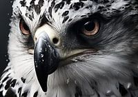 Amber Ogen - Dit indrukwekkende portret van een adelaar, vastgelegd met nauwgezette detailgetrouwheid, spreekt tot de verbeelding met zijn realistische weergave en textuur van veren, snavel en intense oogcontact. De tinten grijs, zwart en het subtiele gebruik van wit benadrukken de textuur en diepte, terwijl de amberkleurige ogen een levendig contrast vormen dat de aandacht grijpt.