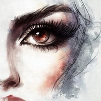Dit kunstwerk laat een portretfragment zien gericht op een amberbruin oog, omlijst door zachte huidtinten en delicate arceringen. De blik is direct maar kalm, met een scherp accent in de iris en fijne wimper details die je naar binnen trekken. Een subtiel vleugje lipkleur verschijnt aan de rand en voegt een rustige menselijke warmte toe…