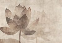 Amber Zen - Dit bloemenschilderij toont een sierlijke, grote lotusbloem in sepiakleur getekend op een doek dat de textuur van geweven linnen nabootst. De lotusbloem, gecentreerd en haast monumentaal in compositie, wordt gekenmerkt door zijn brede, iets naar boven gebogen bloembladen die soepel echter stevig om de kern heen liggen. De achtergrond is discreet gehouden, waar vage contouren van andere bloemen en waarschijnlijk bladeren als schimmen verschijnen, waardoor alle nadruk op de prominente lotus valt. Er zijn delicate lijnen en subtiele texturen binnen de bloembladen te zien, die zorgen voor een gevoel van diepte en natuurlijke gelaagdheid. De keuze voor sepiatinten geeft het schilderij een vintage of tijdloos gevoel, waarbij het monochrome palette het eenvoudig maar elegant maakt.