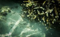 Foto van de koralen en vissen rondom Ambon. De vis die je links van het midden ziet is zeer giftig.