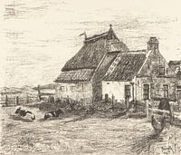 Op het waddeneiland in Friesland, een eiland aan het wad, staat deze boerderij met vee, twee koeien en een haan. Op de achtergrond liggen de duinen aan het strand.