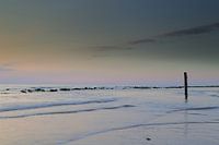 Ameland Hollum sunset met lange sluitertijd. Naast de palenrij liggen hier ook basaltblokken als golfbrekers.Ondanks dit alles moet het strand om de paar jaar opgehoogd worden .