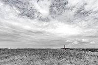 Een imposante verschijning op het eiland is de in 1880 van gietijzer gebouwde 55 meter hoge vuurtoren. Deze foto is zwart-wit met de vuurtoren in kleur.