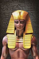 De achtergrond van de afbeelding toont een weelderige omgeving, wellicht een weerspiegeling van zijn rijkdom en welvaart. Met een doordringende blik en een zelfverzekerde uitstraling belichaamt Amenhotep II de grootsheid en macht van het oude Egyptische koningschap. Deze afbeelding is een eerbetoon aan zijn koningschap en herinnert ons aan zijn belangrijke rol in de geschiedenis van Egypte.
