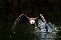 A photo workshop at de Valk in Lunteren (Netherlands). This is the famous Hertog which is an american sea eagle. When the footbal club Vitesse is playing footbal in its home stadium, Hertog is flying its round in the stadium. Now it is catching food from the water surface.#0164