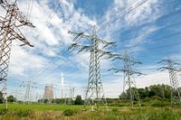 Geertruidenberg Noord-Brabant Nederland The Netherlands Electricty pylons lead away from the coal powered power station Amercentrale
