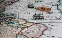 Antieke Blaeu kaart van de Amerikaanse kust gecombineerd met miniatuur koppeltje in roeibootje